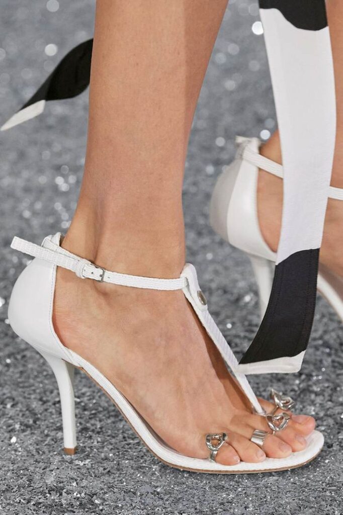 As grandes marcas não ficaram de fora. A Rabanne apresentou argolas douradas em sandálias com detalhes metálicos no desfile primavera/verão 2024, enquanto a Miu Miu optou por um toque irreverente, envolvendo os dedos das modelos com curativos vibrantes e coloridos.