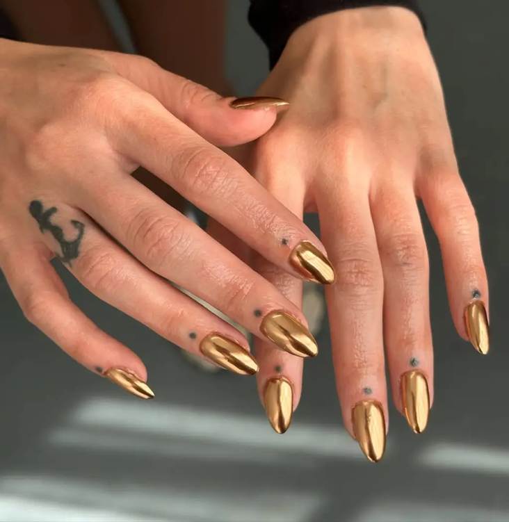 2.Dourado espelhado os metalizados continuam em alta, mas o dourado ganha uma leitura, glam com acabamento cromado que brilha tanto ao sol quanto à noite. Um toque de impacto imediato.