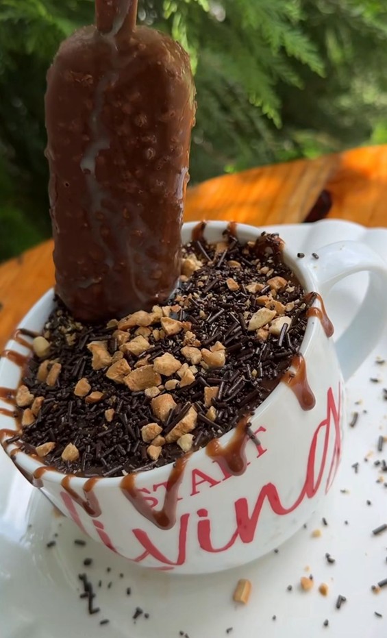 O toque final surpreende: caju torrado por cima, oferecendo crocância e um sabor levemente salgado que equilibra a doçura. E, como se não bastasse, um picolé mergulhado no centro do bolo traz frescor e textura — um detalhe inusitado e perfeito para dias quentes.